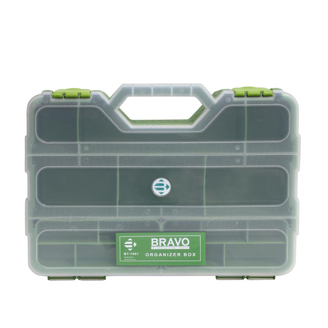 جعبه ابزار پلاستیکی براوو مدل BT-7801 که به جعبه اورگانایزر معروف است. ابعاد جعبه به طول 32 ، عرض 24 و ارتفاع 6 سانتی متر می باشد. این محصول مقاوم در برابر ضربه بوده و تولید شده از بهترین مواد اولیه می باشد. همچنین دارای قفل های پلاستیکی مقاوم و نشکن و نیز ساختار مناسب با بیشترین ظرفیت فضای داخلی می باشد. دارای بیست محفظه داخل جعبه می باشد که توسط جدا کننده های افقی و عمودی سایز این محفظه ها قابل تغییر است.